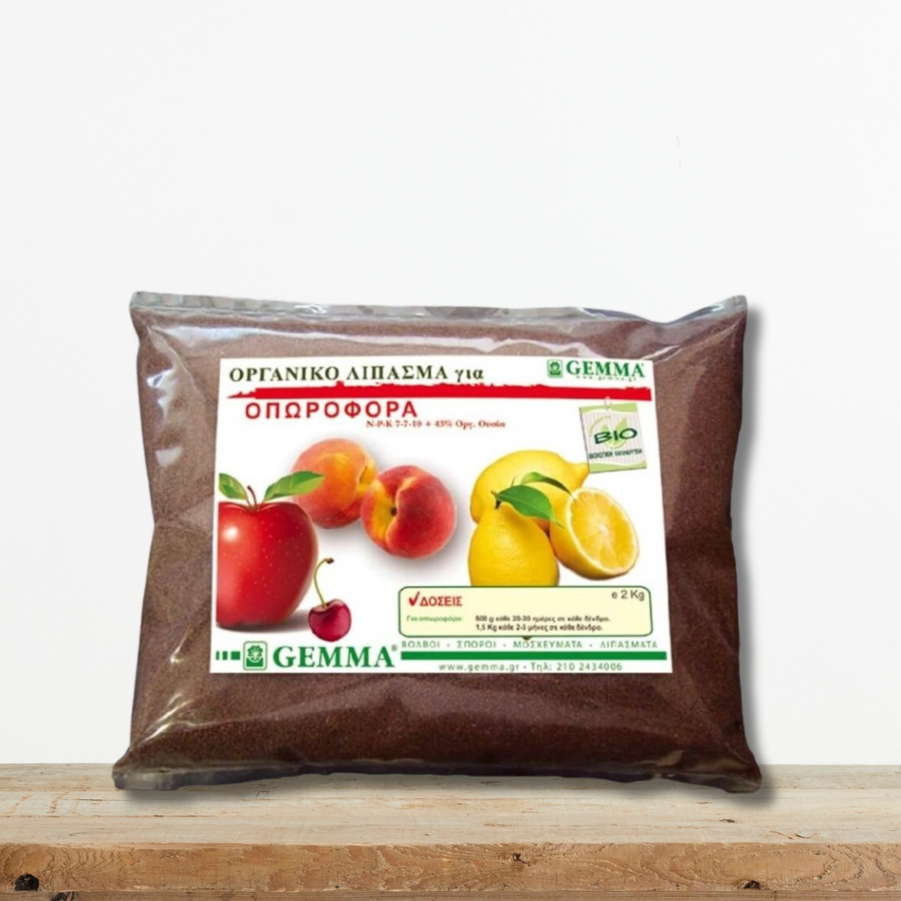 100% οργανικό βιολογικό λίπασμα NPK 7-7-10 σε συσκευασία 2kg, ειδικά σχεδιασμένο για όλα τα οπωροφόρα δέντρα και θάμνους.