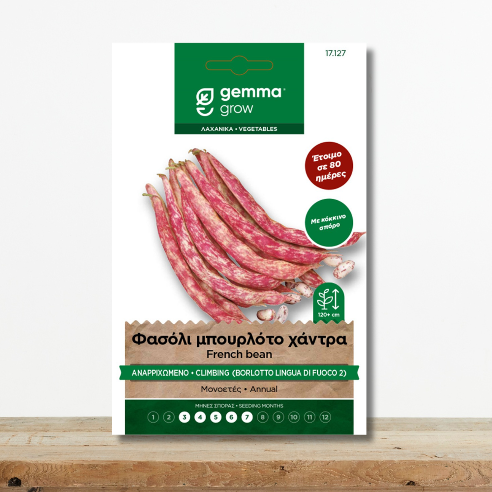 Το Φασόλι Μπουρλότο (Borlotto lingua di fuoco 2) είναι μια αναρριχώμενη ποικιλία που ξεχωρίζει για τους πανέμορφους καρπούς της. Οι λοβοί του είναι μακριοί και ίσιοι, με ένα εντυπωσιακό κρεμ-λευκό χρώμα που καλύπτεται από έντονες κόκκινες ραβδώσεις. Στο εσωτερικό του κρύβει 6-7 μεγάλους σπόρους (χάντρες) με αντίστοιχα χρώματα, οι οποίοι θεωρούνται από τους πιο νόστιμους παγκοσμίως. Είναι η ιδανική επιλογή για όσους θέλουν να απολαμβάνουν φρέσκες χάντρες σε λαδερά, σαλάτες ή σούπες, προσφέροντας μια πλούσια, βουτυρένια γεύση.